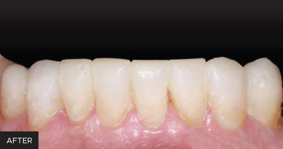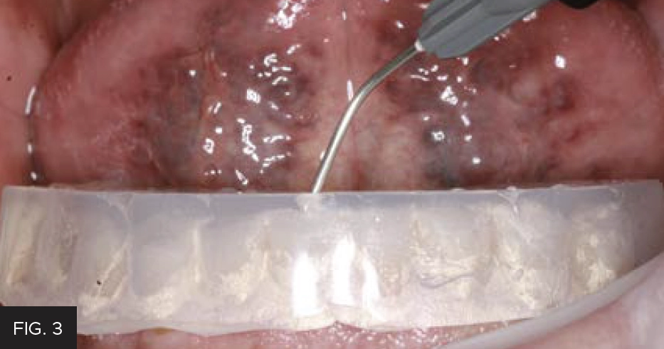 Minimal preparations were done on all teeth, which includes removal of decay, 2mm bevel preparations with a 7901 flame shaped bur (Brasseler) and air abrasion. PTFE tape was placed on #’s 22, 24 and 26. Etching and bonding procedures were done on #’s 21, 23, 25 and 27. The first matrix was placed and the Evanesce Flow Composite (Clinician’s Choice) was injected through the tiny access holes, followed by polymerization of the composite resin through the clear matrix. (FIG. 3)