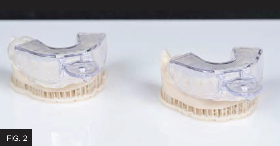 The silicone matrices were fabricated by dispensing the Affinity Crystal Clear Matrix Impression Material (Clinician’s Choice) into the Clear Impression Trays (Clinician’s Choice) and seating the material on the respective 3D printed models. (FIG. 2) Once set, the silicone matrices were removed from the clear trays.