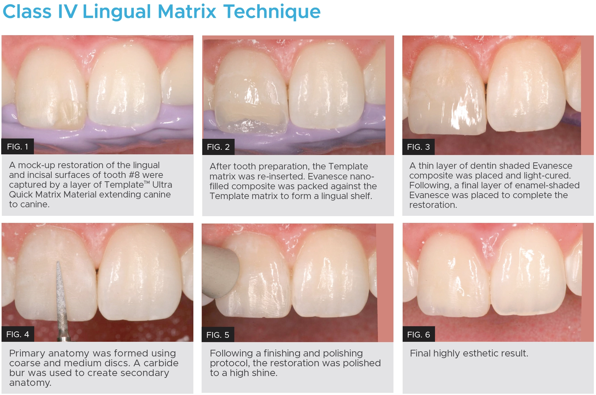 The variations in incisal translucency from one case to the next can be quite dramatic. Tints can be helpful in replicating translucency; however, they can be more technique sensitive and require clinical experience to gauge the appropriate amount of tint required for the case. Fortunately, many anterior composite cases can be restored using a one shade/opacity composite restoration. However, for those clinical cases where there is a high degree of incisal translucency present, you need a composite system that gives you the optional opacities that allow you to match the translucencies in the adjacent teeth. In addition to their enamel opacity of 80%, Evanesce has 3 more enamel options that span a greater degree of translucency, including one that is only 50% opacity. These come in handy when I am restoring Class IVs and placing full composite veneers. The opacity of Evanesce I choose for the initial lingual enamel layer is based on the overall incisal translucency that I want in the final restoration. The Evanesce system provides me with the control, through its range of opacities, to blend in the next layers composite I require to achieve the desired esthetic result.