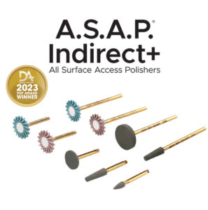 Adjusting zirconia is so much faster now. Evaluating and adjusting proximal contacts and occlusion has always been very straightforward. The time-consuming part was progressing through various polishing steps to get the high shine back to the adjusted surfaces. The A.S.A.P. Indirect+ system is a 2-step polishing system, but the kit includes coarse adjusters that I have incorporated into my polishing regimen to remove bur scratches. Now my adjustment/polishing of zirconia takes anywhere from 2–4 minutes, and the result is exactly what I want.