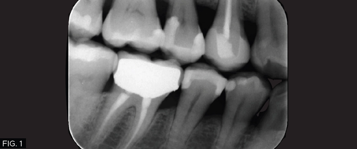 A young female physician presented to my office with a chief complaint of sensitivity to cold and sweets in her lower right dentition which has been persistent for approximately 1 month. Upon clinical and radiographic examination, it was determined that her lower right first premolar #28 (#44) had a previous restoration that had fractured and was compromised by recurrent caries. (FIG. 1)