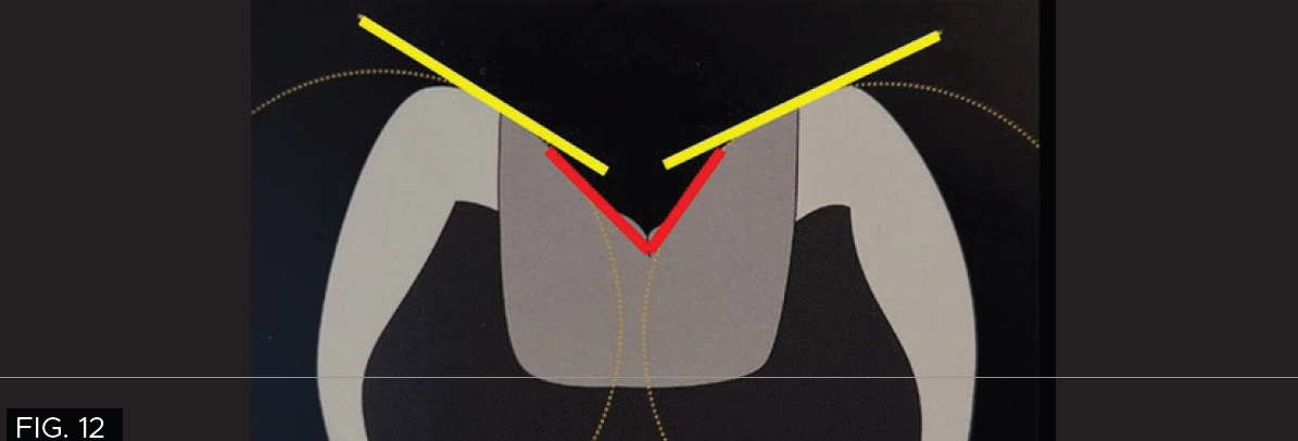 However, a cross section of the occlusal theme of tooth #28 (#44) commonly has two planes connecting both buccal/lingual cusp tips into the central groove and both mesial/distal fossae as indicated with the red and yellow lines which must be taken into consideration. (FIG.12)