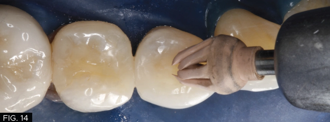 In order to smooth the occlusal anatomy that was created with the flame shape diamond bur and provide a high gloss finish on the composite resin, a set of A.S.A.P.® Diamond Polishing Brushes (Clinician’s Choice) with 45-micron and 6-micron diamond particles respectively were applied over the composite restoration for 10-20 seconds per brush. (FIG.14)