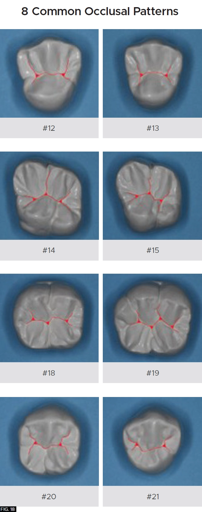 As with any dental restoration, it is paramount that if it is to function properly and to be undetectable, the natural tooth morphology must be adhered to. There are essentially 8 common occlusal anatomy guidelines in posterior human tooth shape. (Refer to Figure 18 on the bottom of the page) This is only a guideline as variations in human occlusal tooth anatomy can be expected in nature. For this patient, using anatomical guidelines, tooth #28 (#44) occlusal theme is depicted in Fig 11.