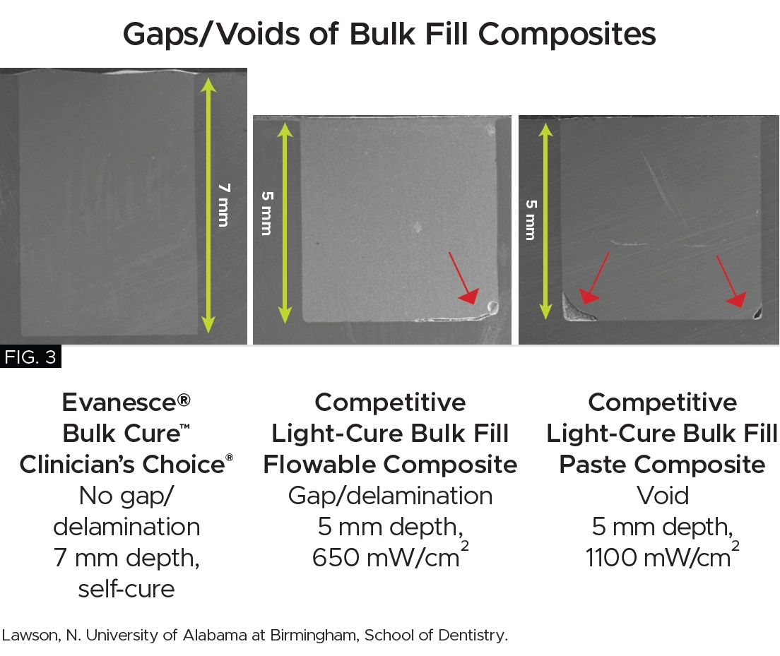 - Bio-Adaptive™ Restorative Performance: The flow characteristics of Evanesce Bulk Cure ensure gap-free margins with all bonding techniques, promoting optimal sealing of both dentin and enamel to enhance marginal integrity, minimizing the risk of microleakage. (FIG. 3) Evanesce Bulk Cure will easily adapt to irregular line angles or preparation variables. Both placement and shrinkage voids are consistently prevented at the proximal box, a common challenge with all light-cure composites.