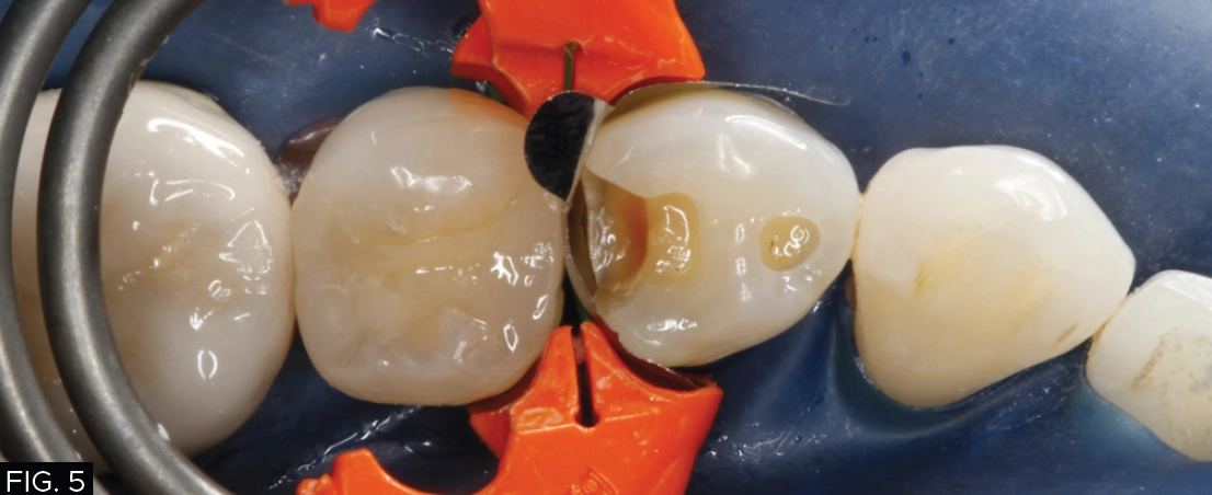 The carious lesion was rather deep into the tooth according to the radiographic image but not wide. The carious lesion was less than ½ the distance between the buccal/lingual cusp distance making this an excellent case for a direct composite restoration. (FIG. 2)
