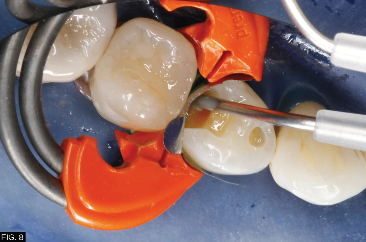 A thin layer of my restorative material of choice, Evanesce Bulk Cure in shade A2 (Clinician’s Choice) was used to build up the distal proximal wall. The canula was used to move the material from the gingival floor up the sectional matrix and light-cured for initial polymerization thereby turning this restoration into a Class I occlusal restoration. I routinely turn all my Class II restorations into Class I preparations so that I can remove the rings and matrix bands, allowing me to focus on the proper occlusal anatomy without interference. (FIG. 9)
