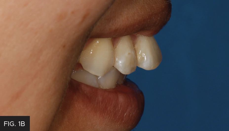 I approached this case, as I do every case, with the Kois 10-step Management Considerations. In this instance, Step 1 (upper anterior), Step 2 (upper posterior), Step 3 (lower anterior) and Step 4 (lower posterior) were applicable. In addition to the fractured teeth, her anterior teeth were misaligned. (FIG. 1A and 1B) The patient agreed to a treatment plan that included an aligner therapy to straighten the four maxillary anterior teeth (lateral incisor to lateral incisor), whiten her dentition, and restore teeth #8 and #9 with composite resin.