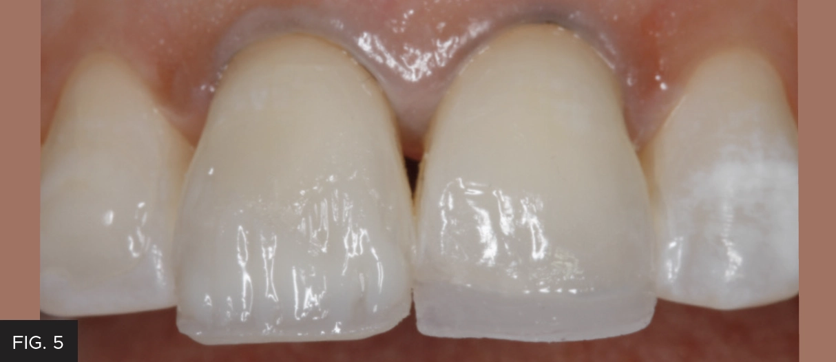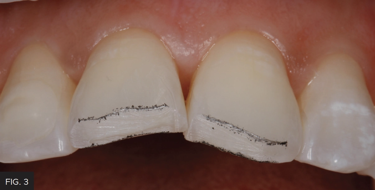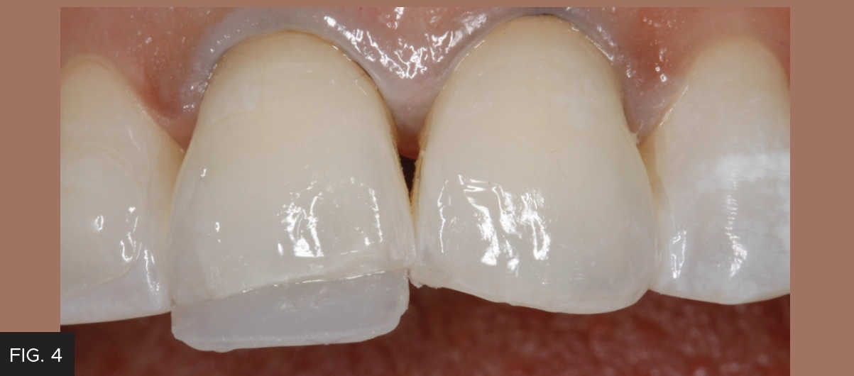 Bevel design plays a significant role in the degree to which the restoration will disappear into the tooth. The fracture lines on teeth #8 and #9 received a 45° bevel using a course, black striped, diamond bur in a highspeed handpiece. A F8888 fine diamond (Brasseler USA®) was used to complete a starburst bevel of 4-5 mm. (FIG. 3)