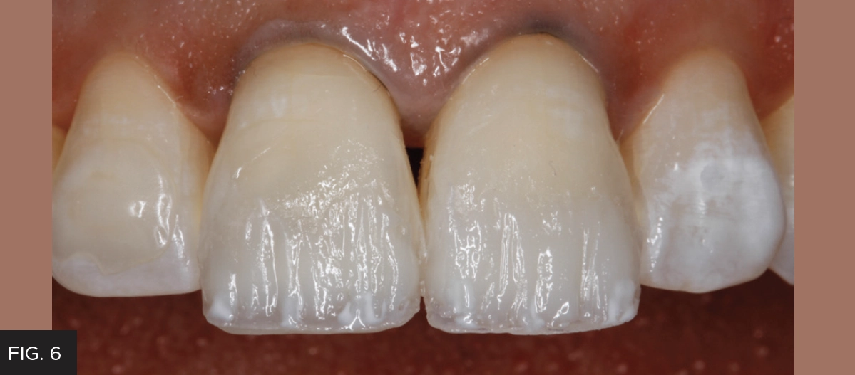 A layer of Evanesce Enamel White (ENW) was placed into the lingual matrix in the area corresponding to tooth #8, using a Compo-Ject™ (Clinician’s Choice) composite gun. To avoid trapping air, the tip of the compule never left the composite. A Multi-Use Composite Instrument (Cosmedent®, Inc.) was used to adapt a very thin, uniform layer of ENW between the inciso-buccal line angle and the scribed line on the lingual matrix. The lingual matrix was placed on the teeth and this layer was gently connected to the lingual margin of the preparation using the Multi-Use Instrument. A #3 Composite Brush (Cosmedent, Inc.) lightly coated with ResinBlend LV (Clinician’s Choice) smoothed and further thinned out the lingual shelf, removing any excess ENW at the inciso-facial line angle with the Multi-Use Instrument. This unfilled modeling resin does not contain HEMA, so it will not alter the physical properties of the composite, nor will it discolor over time. The lingual layer was then light-cured for 20 seconds and the lingual matrix was gently removed. (FIG. 4)
