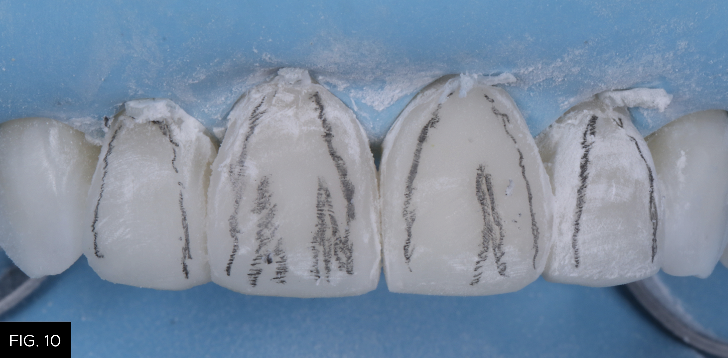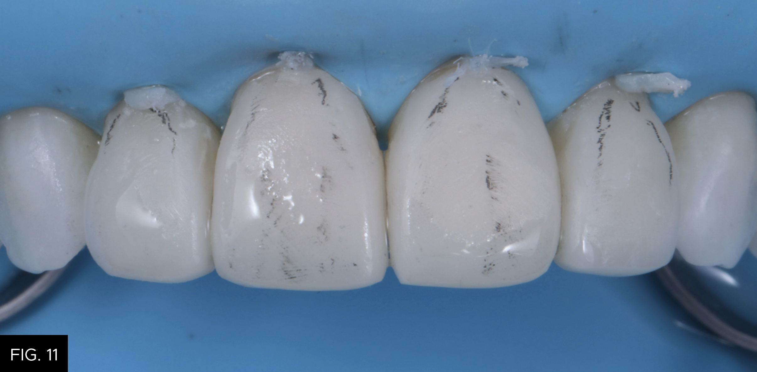 The challenge with direct veneers is to create ideal emergence profiles in the cervical and interproximal areas. With the help of the new Unica anterior matrix from Polydentia, it is now possible to build this in a single step as to create creating more natural tooth shapes thereby reducing the finishing time of the restorations. (FIG. 8) With the palatal, incisal, cervical, and interproximal areas established (FIG. 9), it becomes simple to finalize the buccal surface. Here we use a pencil to outline the macro anatomy and transition lines. (FIG. 10, 11) Using a course flame-shaped diamond with a red ring, handpiece with an electric motor, along with the ideal shaped Contours Coarse Anatomy Trimmers (Clinician’s Choice), natural anatomy was achieved. A 12a scalpel blade was also used in interproximal areas that are difficult to access. The interproximal surfaces were refined with the Contours Finishing & Polishing Discs (Clinician’s Choice), using the medium and fine grits as required.