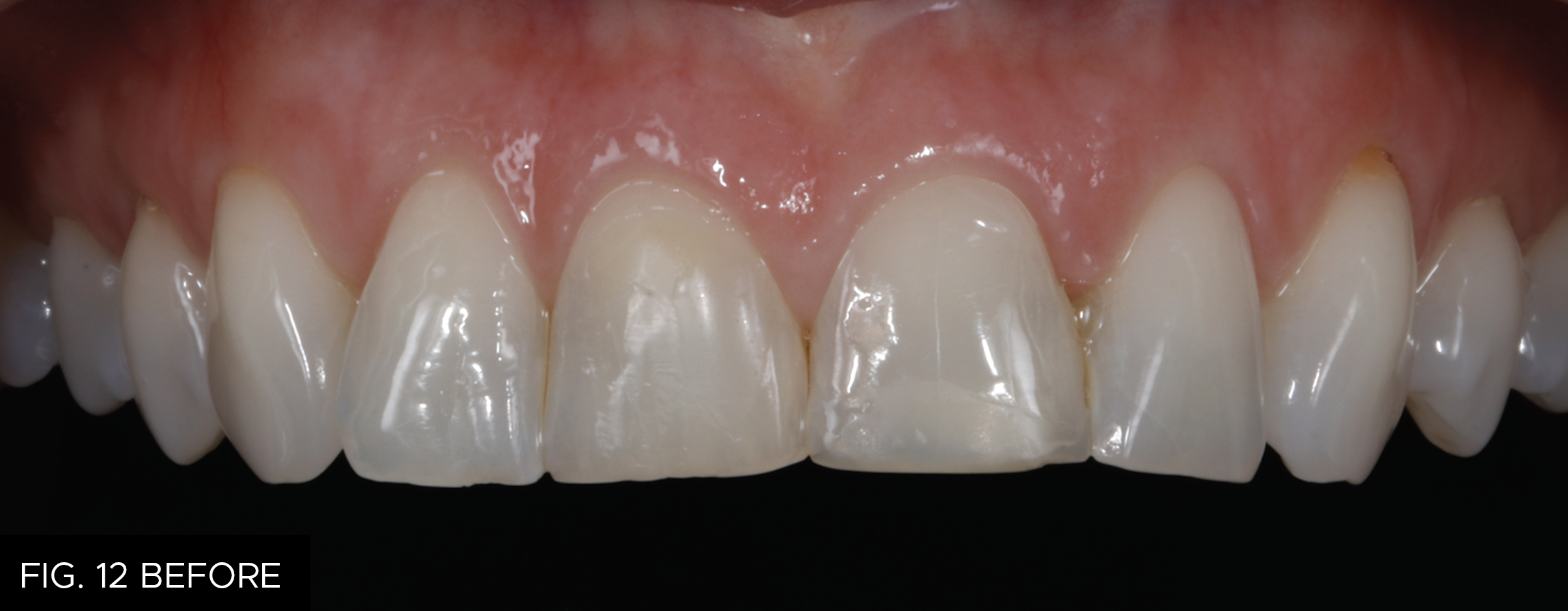 The rubber dam was removed, and the final polishing was done quickly with the two step A.S.A.P. All Surface Access Polishers (Clinician’s Choice). The purple Pre-polisher should be used lightly at 8-10,000 rpm to smooth the surface but not remove macro anatomy. Next the peach Final High Shine Polisher was used in a similar fashion to create the desired high luster. (FIG. 12 Before & After)