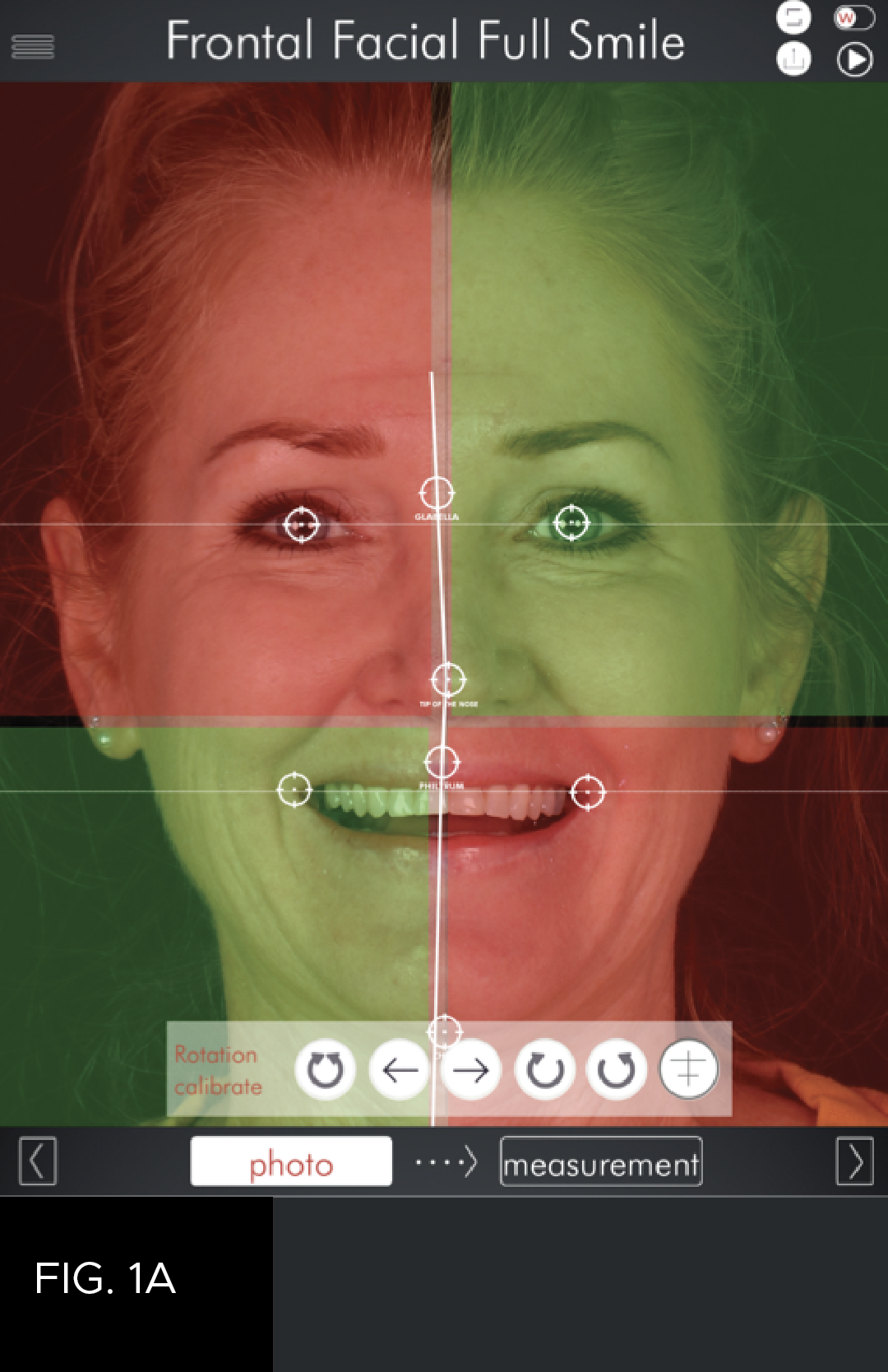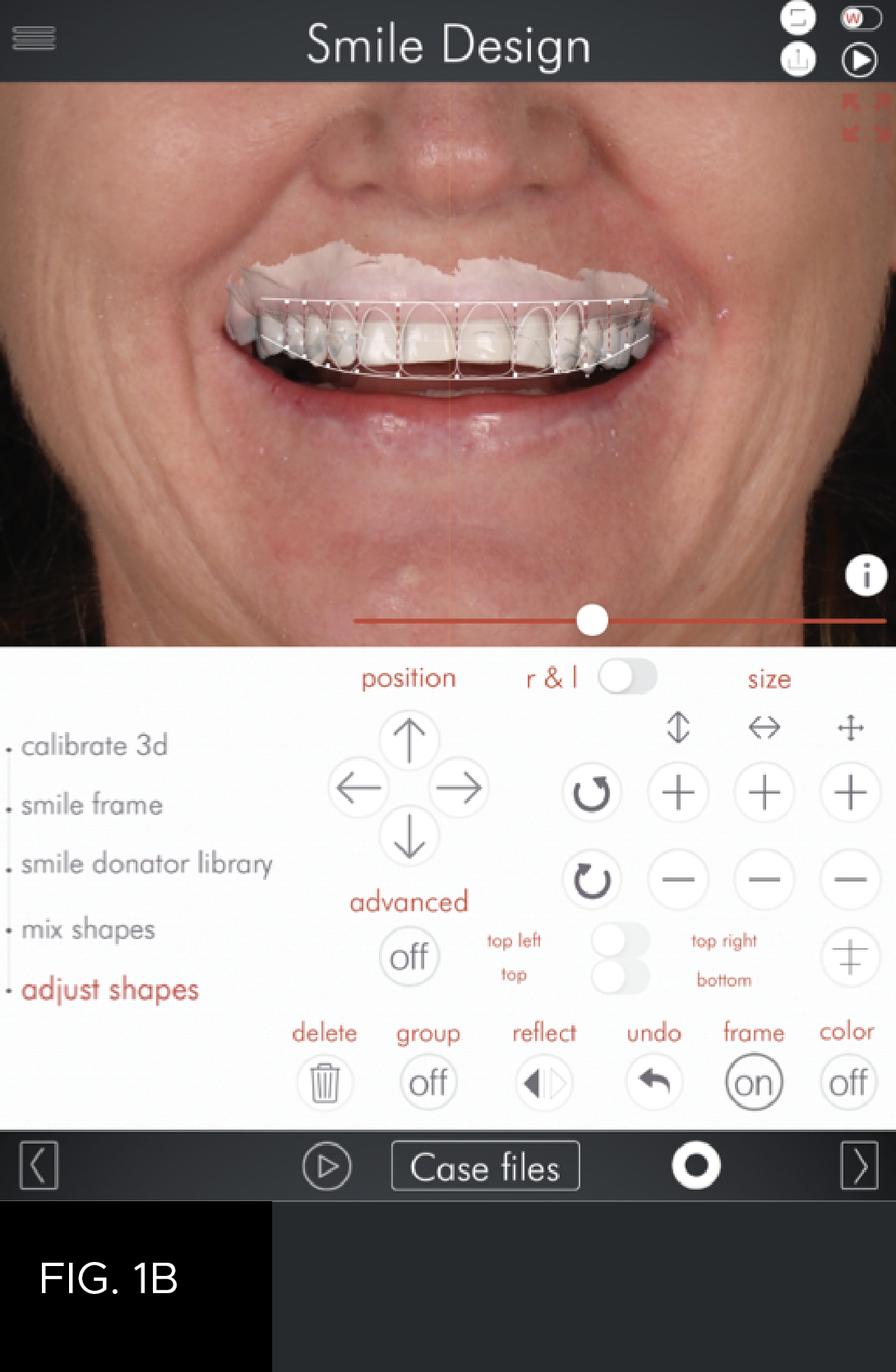 Using digital records, we will initially create a 2D plan that will determine the ideal position of the central incisor in relation to gingiva, lips, and face (Orofacial analysis). During the 2D design, we will also decide on the tooth shape utilizing libraries of natural teeth. The 2D design will finally determine the ideal smile frame into which the teeth will fit. This will show the new intended gingival margins as well as the correct smile curve. In this case, the 2D design was done using the DSDApp (this software being available on the iPad). (FIG 1A and 1B)