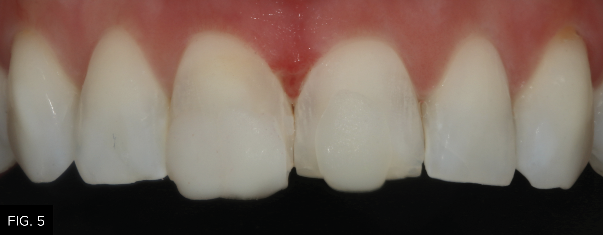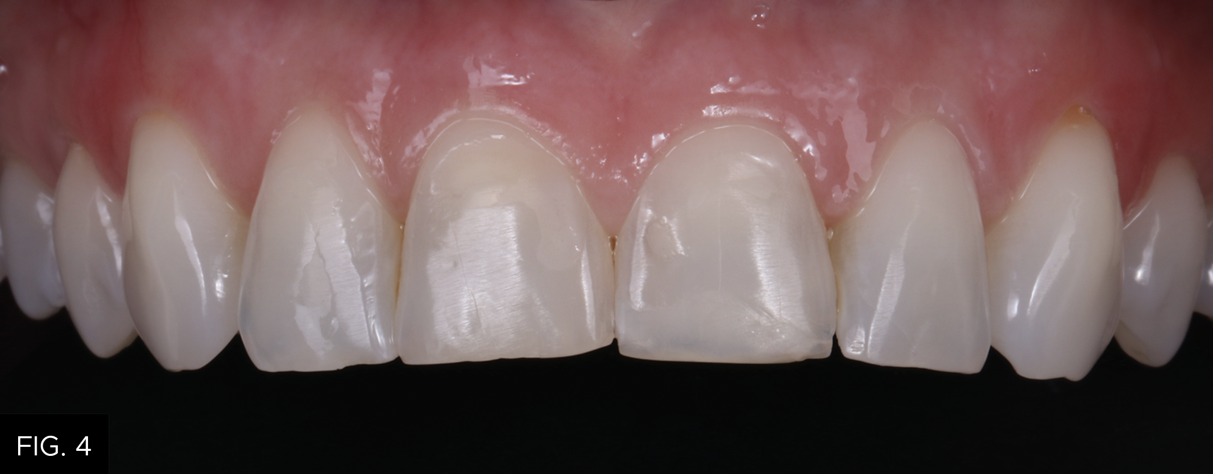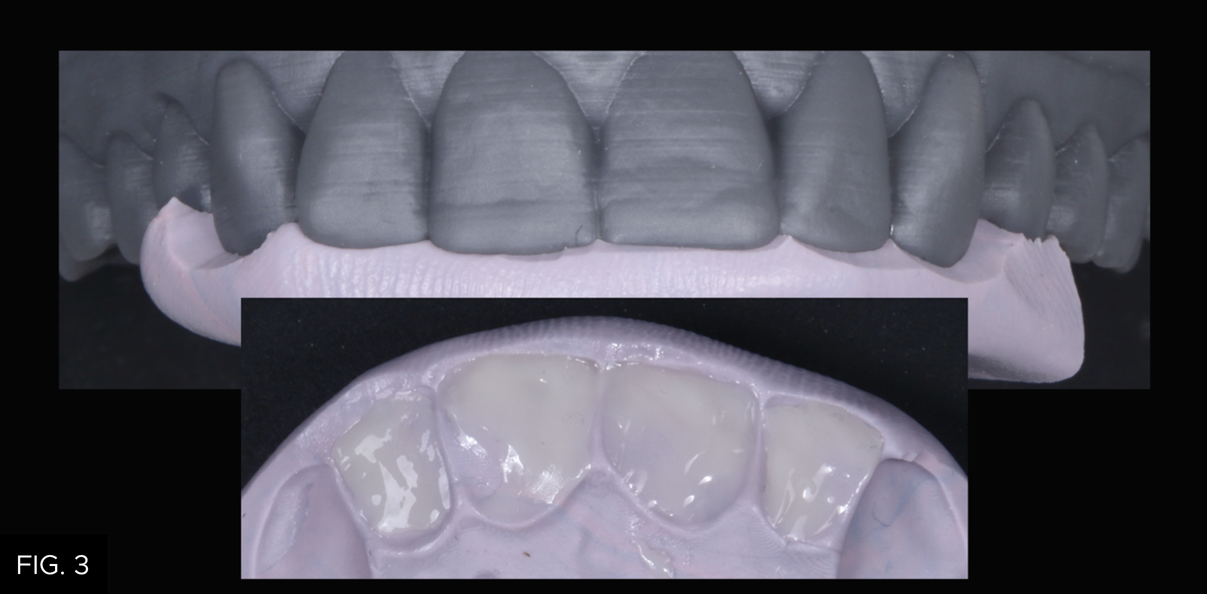 With the help of the 3D design, it was clear bonding would be required on the six upper anterior teeth. The dental laboratory sent through the ideal suggestion on Communicate (3 shape App) (FIG. 2), this was accepted, and the model was printed. This model was used to provide a palatal stent to control both the incisal length/shape and occlusion. (FIG. 3) It should be noted that a conventional wax up could be used to fabricate the stent to control the lengthening of the anterior teeth.