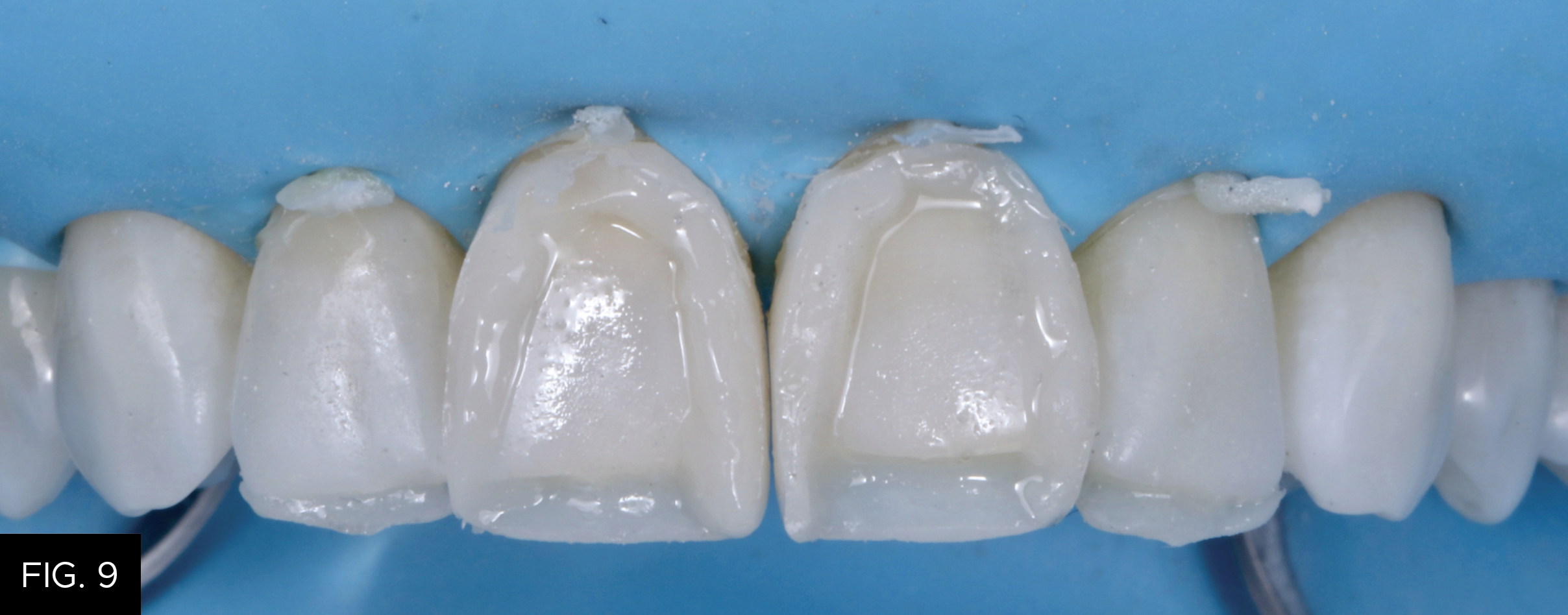 The silicone index is then used to build the palatal shell. This also controls the ideal incisal length and shape (FIG. 7).
