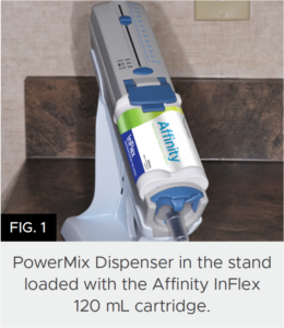 The PowerMix™ (Clinician’s Choice®) impression delivery system solves a variety of chairside impression issues. The unit (FIG. 1) operates as a battery-powered or plug-in unit designed to deliver through 120 mL cartridges, the heavy body impression material, in addition to an alginate substitute, CounterFit™ II (Clinician’s Choice®).