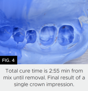 The tray is a Quad-Tray® XL, which helps contain the material and prevent flexure of the tray, for increased accuracy. When margins are close to the gingival level or below it, often retraction cord may not expose the entire margin. Utilizing a higher viscosity material, such as InFlex can push the light body material sub-gingivally and adapt to the margin and cervical areas of adjacent teeth. From time of mix until removal, the total cure time is 2:55 min. The final result is an excellent impression. (FIG. 4)
