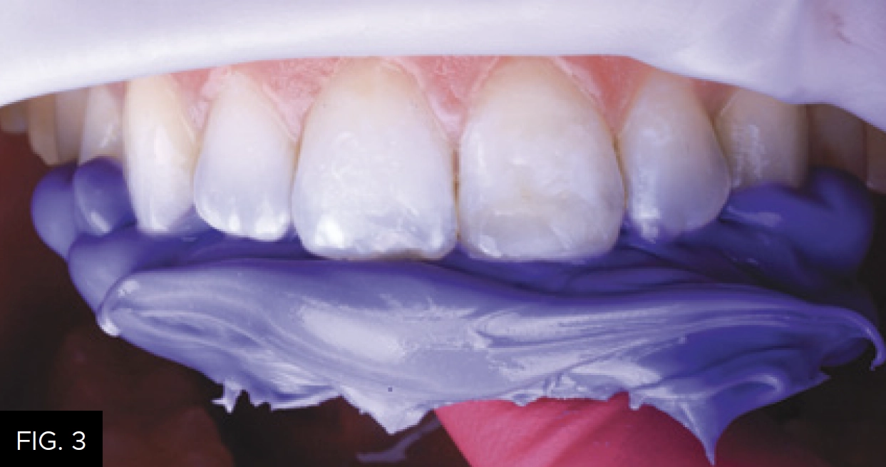 A lingual matrix impression made with Template Matrix Material (Clinician’s Choice) was then made from the intraoral mock-up. The information derived from the mock-up can now be accurately transferred to the final restoration. The Template matrix was trimmed using a #12 scalpel such that no material extends beyond the inciso-facial line angle. This is a highly accurate, fast and efficient means of quickly establishing the ideal lingual contours and incisal length to the final restoration within minutes of completing the mock-up. (FIG. 3)