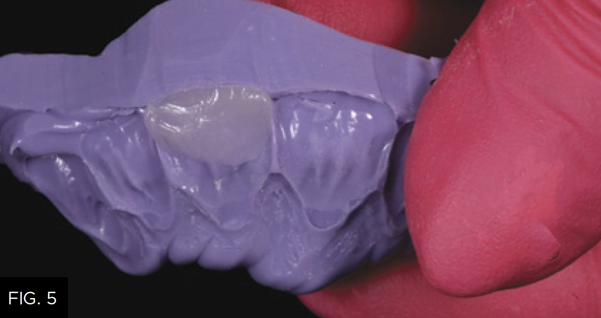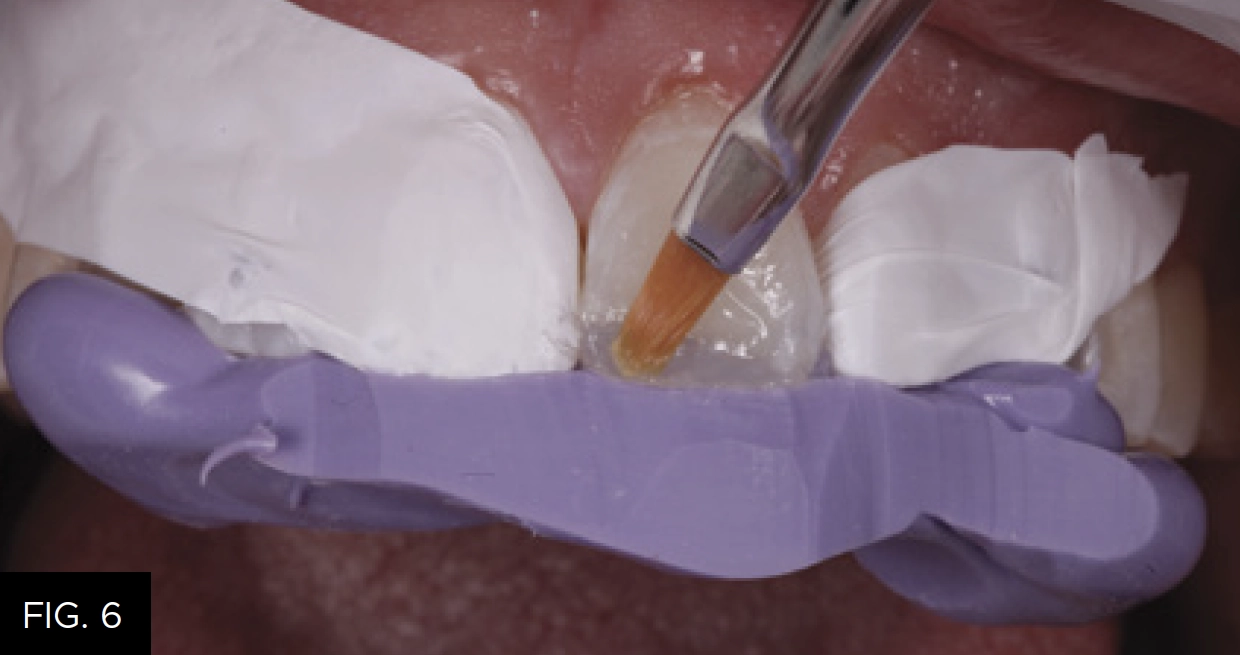 The Teflon tape was placed on the adjacent teeth after the application of the adhesive as the chemicals may quickly breakdown the Teflon itself. The trimmed lingual matrix was placed onto the teeth and an explorer was used to scribe a line along the fracture. This line will help in limiting the extent of composite necessary for the lingual shelf. My preference for the lingual shelf is an achromatic composite as a more translucent lingual shelf allows for a translucent incisal edge and layering in of tints and creating halos, while acting as a foundation for subsequent composite layers. A very thin layer of Evanesce FX Enamel Clear (ENC/Clinician’s Choice) was adapted into the Template matrix up to the scribed line. (FIG. 5)
