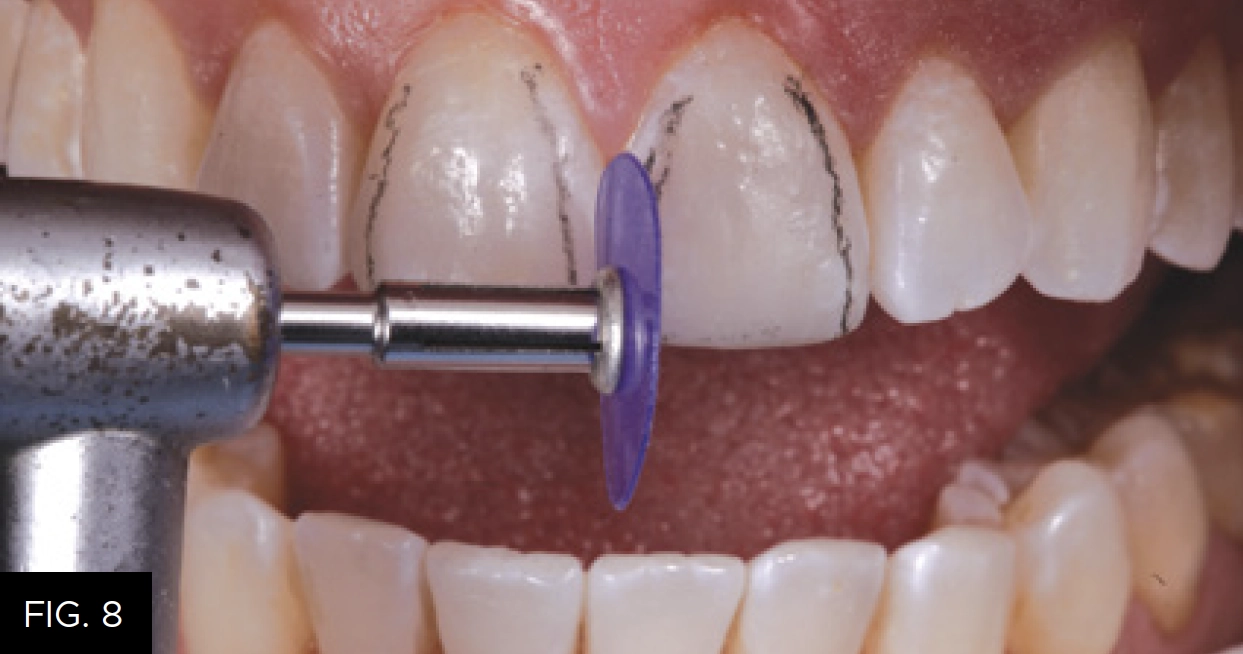 Finishing of the restoration is always a systemic approach starting with the primary anatomy: incisal edge position, facial line angles, then facial planes. Using a pencil line, the incisal edges of the adjacent teeth and new restoration were marked and adjusted with a coarse Contours disc (Clinician’s Choice). Using a lingual matrix resulted in only a minor incisal edge adjustment. The side of the pencil tip was used to mark the line angles on the restoration and adjacent teeth. To make the restoration appear wider, I moved the line angles out by adjusting the facial surface with the disc. Using the disc on the embrasure side will move the line angles inward and give a more narrow appearance. (FIG. 8)