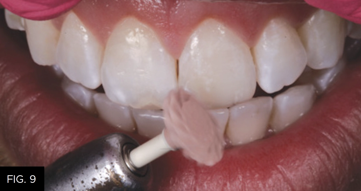 The goal of polishing is to mimic the reflective surface finish of the adjacent tooth. A.S.A.P. 2-step diamond polishers (Clinician’s Choice) produce a high shine luster in under a minute with only one shape. It may be necessary to use Enamelize polishing paste (Cosmedent) on a Groovy Diamond Polisher (Clinician’s Choice) to achieve an even higher luster. In this case, the polisher step was limited to the purple A.S.A.P. Pre-polisher and the peach Final High Shine polisher. (FIG. 9)