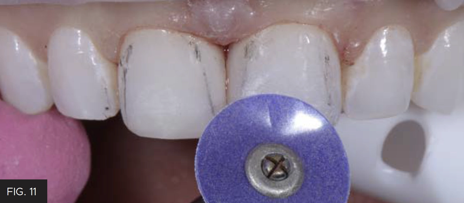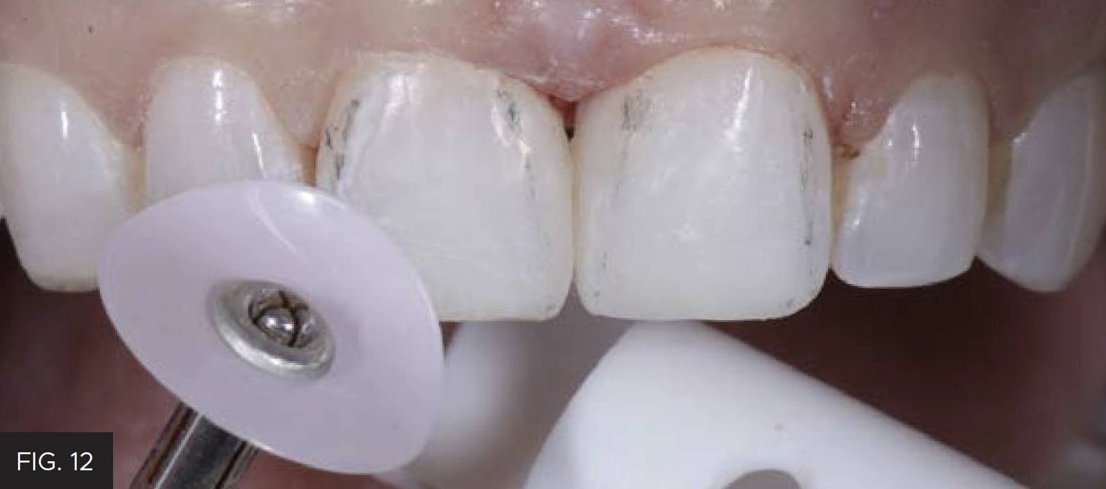 In this case, the finishing protocol involved the placement of a wedge prior to adjusting. This initiated tooth separation that would increase the access and accuracy to adjust the emergence profiles later in the protocol. Once the length and inciso-facial line angles were confirmed, the facial planes and proximal line angles were surveyed. The side of a pencil lead was used to outline the proximal line angles on both the restorations and adjacent teeth and compared. A coarse Contours Finishing and Polishing Disc (Clinician’s Choice) was used to correct the proximal line angles to better reflect those on the lateral incisors. (FIG. 11) Axial inclination was assessed through visualizing from various cervical, incisal and proximal angles and adjusted accordingly with the same coarse disc. The sequence of medium, fine and super-fine discs was followed to prepare the restorations for polishing. (FIG. 12)