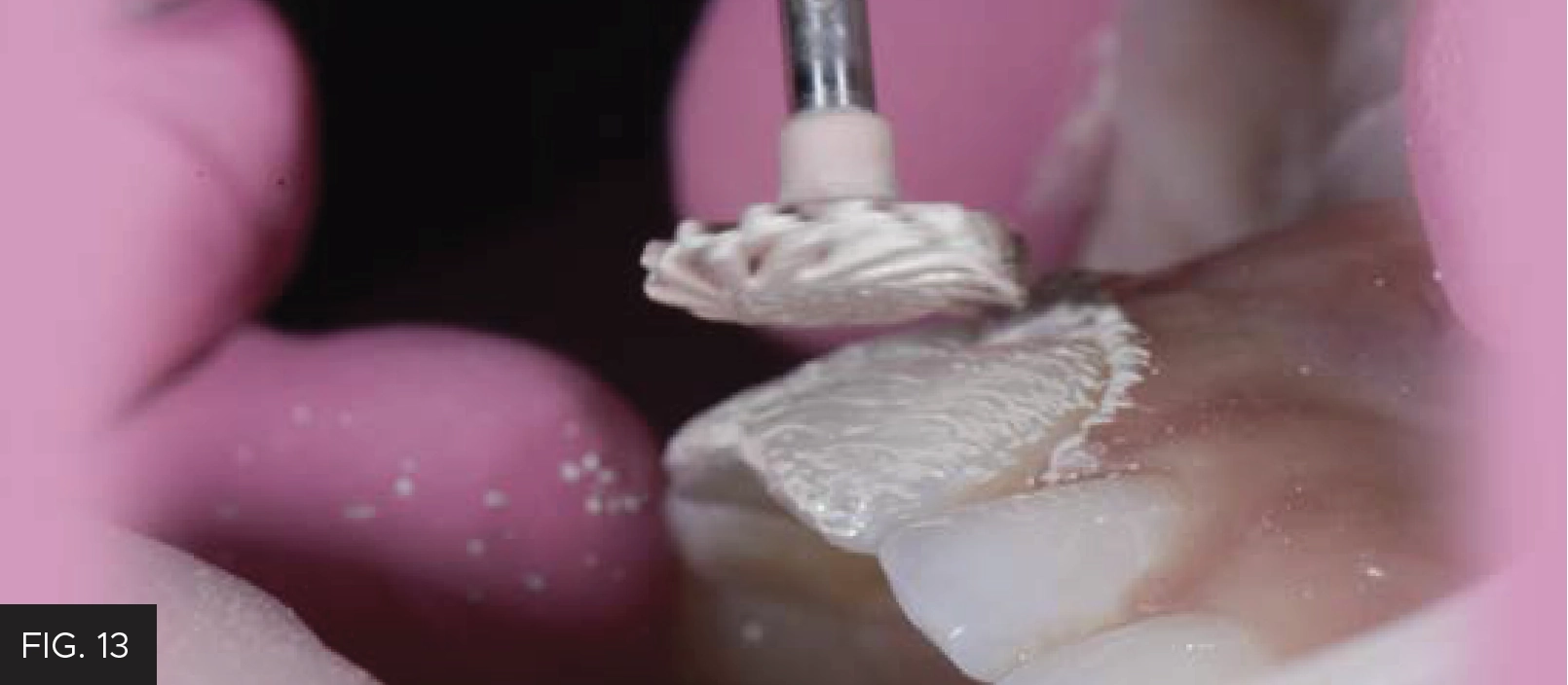 While A.S.A.P. Polishers can bring out a very high luster, this was further enhanced using a small amount of Enamelize Aluminum Oxide Polishing Paste on a Final Shine Cotton Polishing Wheel (Clinician’s Choice) with a light touch. (FIG. 14)