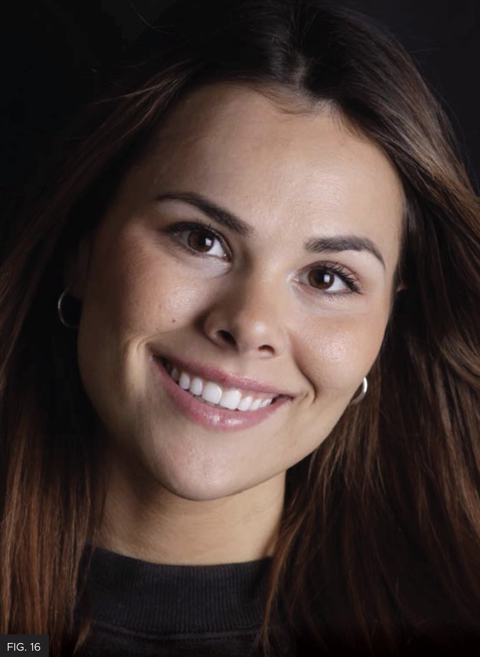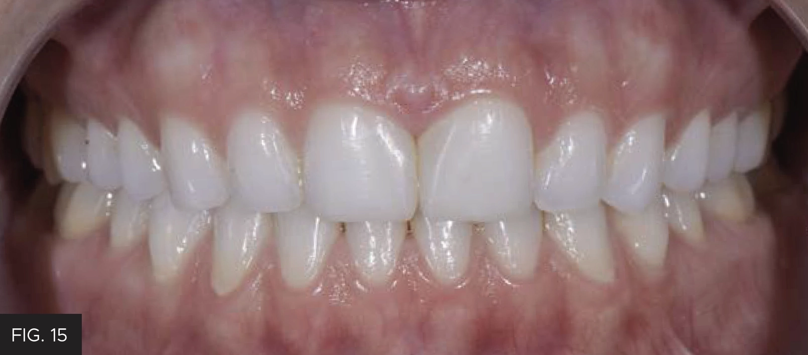 A complex treatment plan that encompasses multiple modalities can result in a lengthy treatment timeline. In this case, the long-term solution to the restoration of a worn anterior dentition to a more natural length and contour could only be addressed after an additional orthodontic phase. Even with a thorough understanding and agreement to the process, this young patient became unsure and disillusioned at a critical point in her treatment. Fortunately, after reviewing the progress that had been made, along with the trust that was built up to that point, restored the confidence to stay the course. It is, therefore, essential to continue to nurture the professional relationship that fosters cooperation and re-affirmation of the success of each step on the path that leads to the anticipated esthetic restorative result. (FIG.16)