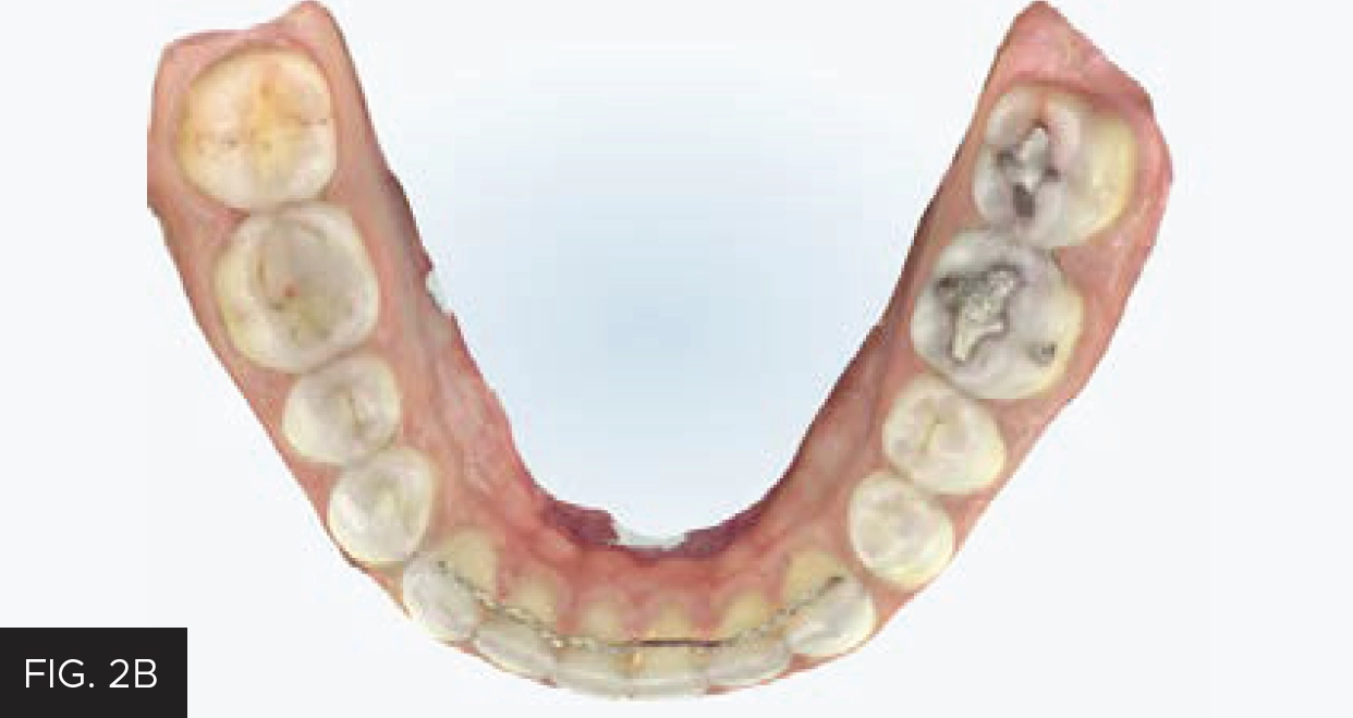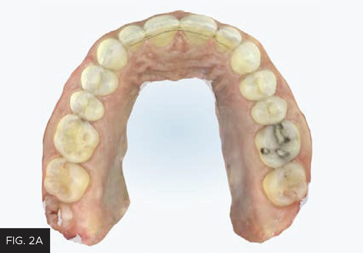 Once the orthodontic goal of the treatment plan was achieved, the restorative phase entailed the closure of the midline diastema and lengthening and recontouring of teeth #8 and 9. Itero (Align technology) scans of the maxillary and mandibular arches (FIG. 2A, 2B) were obtained from which diagnostic models were fabricated.