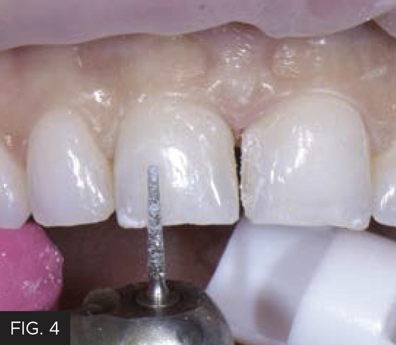 Once the existing midline restorations were removed, a starburst bevel was established on the facial surfaces of teeth #8 and 9 using a F8888 (Brasseler) fine diamond bur. A short bevel was placed on the lingual of these teeth.