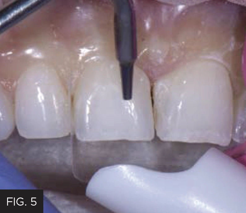The patient was anesthetized due to the removal of existing composite as well as the possibility of wedge placement during the finishing stage. Shade selection was achieved by placing small round samples of possible composite shades onto the facial surface of teeth #8 and 9. These were light-cured and a black and white photo of the selected shade was taken to confirm the correct value of the shade. Evanesce composite (Clinician’s Choice) was selected for this case because of its handling qualities, specifically its smoothness in spreading across the tooth surface, its ability to easily blend into the surrounding tooth structure, its polishability, and the absence of air bubbles. An Optragate Retractor (Ivoclar) provided a clear, wide field that allows context for consistency in restoration shape, inclination and emergence profile with the adjacent teeth. Existing composite restorations were removed from the mesial surfaces of teeth #8 and 9 using a F8888 fine diamond bur (Brasseler) at high speed while establishing a starburst bevel on the facial surfaces. (FIG. 4) A coarse Contours Finishing and Polishing Disc (Clinician’s Choice) was used to smooth out any sharp edges or points. Finally, a PrepStart (Danville) air abraded the prepared surface to remove any enamel and composite debris and enhance overall adhesion. (FIG. 5)
