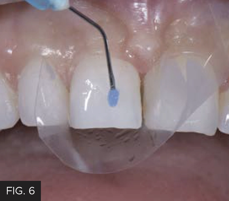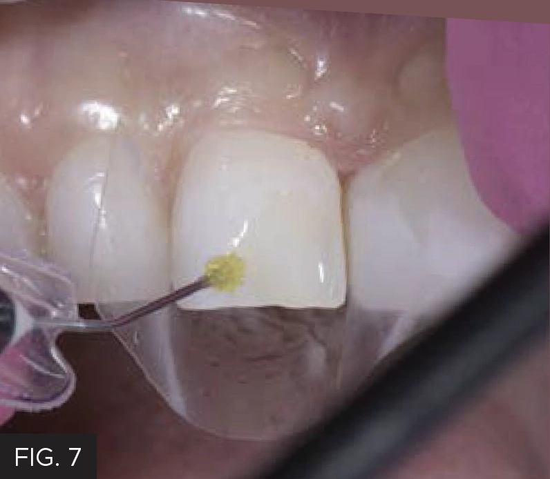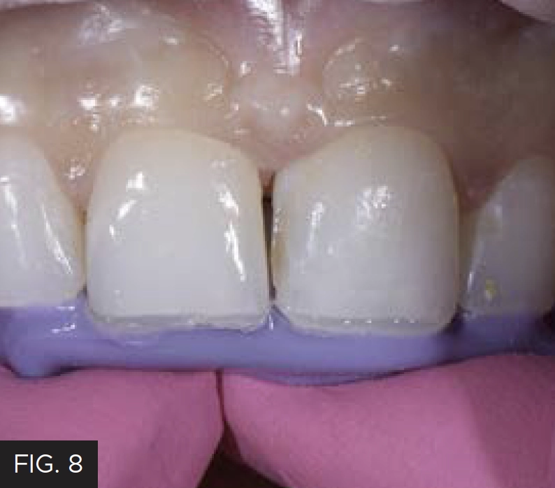 Mylar strips isolated teeth #8 and 9 from the adjacent teeth while the facial and lingual surfaces were etched with 35% phosphoric acid for 20 seconds (FIG. 6) then thoroughly rinsed. Adhese Universal (Ivoclar) adhesive was applied to the etched surfaces (FIG. 7), air- thinned and light cured.