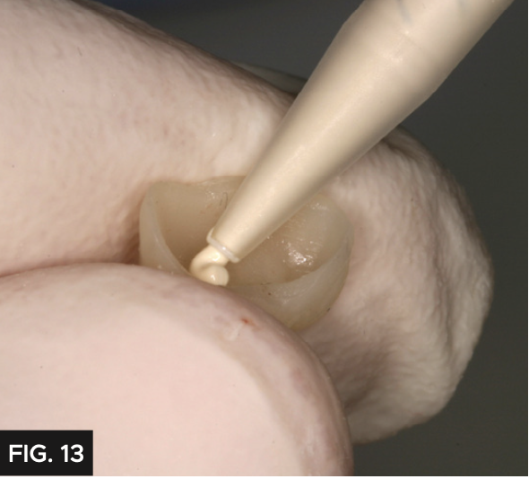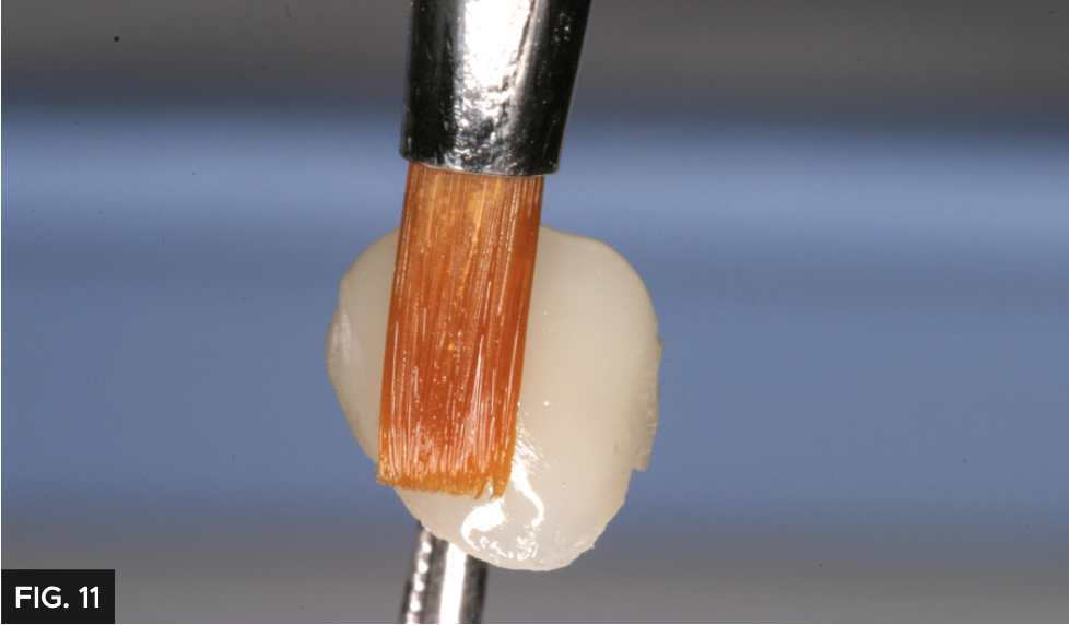 Prior to cementation of the provisional, polishing the temporary crown is important to prevent staining and allows for a higher degree of esthetics. In this case, the Inspire provisional composite was polished using finishing discs and the final glaze was obtained using Glisten™ Provisional Resin Glaze (Clinician’s Choice®). Applying a very thin layer of Glisten with a brush (FIG. 11) and light-curing for 20 seconds, minimizes the finishing time and provides a high gloss finish without affecting the occlusion.