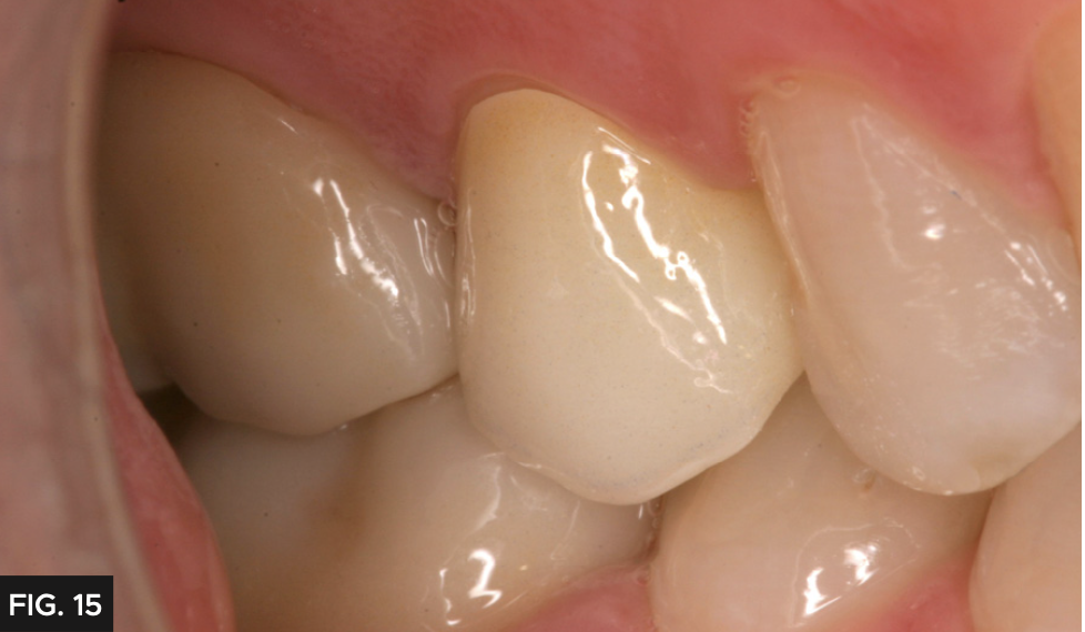 A common clinical problem with provisional restorations is premature dislodgement, which is frustrating for the patient and results in a costly repair appointment. For added retention, the crown was cemented with Cling2® (Clinician’s Choice®). Cling2 has a more retentive chemistry to prevent loss of the provisional before the seating appointment. The provisional was loaded with Cling2 (FIG. 13) and placed over the preparation and allowed to set for two minutes. The excess was easily removed with a curette. (FIG. 14) It is common to have excellent tissue health at the final cementation as Cling2 has a bacteriostatic effect.