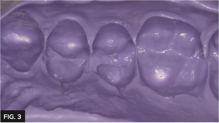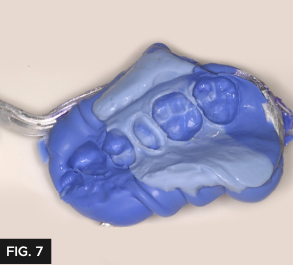 This technique provides great detail and has a perfect flow to allow the impression material to encompass the prep without the InFlex tray material showing through. (FIG. 6) Affinity InFlex has a higher durometer hardness to support the Quad-Tray Xtreme’s sideless wall design and will not distort during pour up. (FIG. 7)