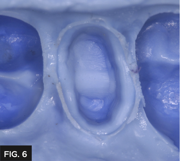 During retraction cord placement, it is crucial to avoid tearing the connective tissue which induces bleeding. To prevent connective tissue damage, light application pressure is used, packing the cord more horizontally while it enters the sulcus. Vertical compaction of the cord with heavier pressure will likely induce bleeding. Following this technique results in adequate tissue retraction without bleeding. Immediately before syringing the Light Body impression material, remove the top retraction cord to allow access to the margin and sulcus. Next, the impression was taken using a Quad- Tray® Xtreme™ metal impression tray with Affinity™ Light Body High Flow and InFlex fast set impression tray material (Clinician’s Choice®). The rigid Quad-Tray Xtreme will not distort due to its aluminum design and low walls. Many dentists choose a flexible plastic impression tray for cost reasons but overlook how plastic trays easily distort, especially in dual-arch impressions. Impression distortion is difficult to observe at the impression stage, however, is often evident at the cementation stage. Inaccurate impressions waste valuable chair time for the dentist and patient with compromised fit and potential issues with longevity. A rigid impression tray coupled with a rigid tray material are essential for eliminating the chance of distortion while maximizing cementation efficiency and overall fit. Affinity Light Body High Flow was injected over the preparation, keeping the placement tip submerged in the material and always moving forward which allows the material to lead the way and results in a bubble-free impression. (FIG. 5)