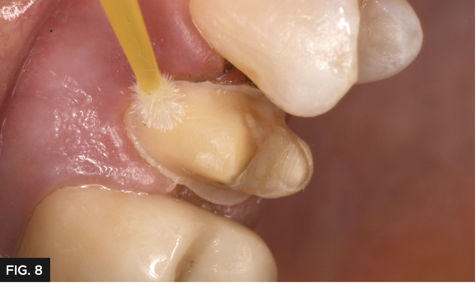 Given the patient’s sensitivity upon biting and to prevent post-operative sensitivity, the preparation was scrubbed with G5™ All-Purpose Desensitizer (Clinician’s Choice®) using a micro brush for 10-15 seconds. (FIG. 8) It is important not to allow the G5 to contact the soft tissue and is recommended to be used sparingly. Provisional composites vary with heat generation, oxygen inhibited layer thickness, strength and polishability.