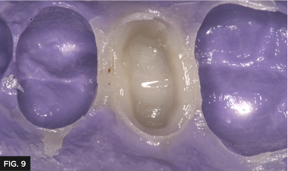 The provisional restoration was fabricated using (Clinician’s Choice®) bis-acryl composite due to its high strength along the margins, thin oxygen inhibited layer and minimal heat generation. The material was injected into the pre- operative Template/TempTray matrix and placed in the mouth for two minutes. This early mouth removal time prevents the provisional from adhering to the preparation; however, complete polymerization takes a couple minutes longer. (FIG. 9)