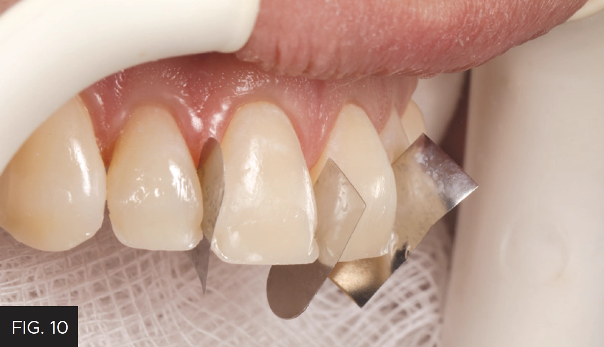 All anterior maxillary teeth were isolated using a length of dead soft metal matrix, and phosphoric acid was placed up to the middle 1/3 of all teeth simultaneously. (FIG 6)