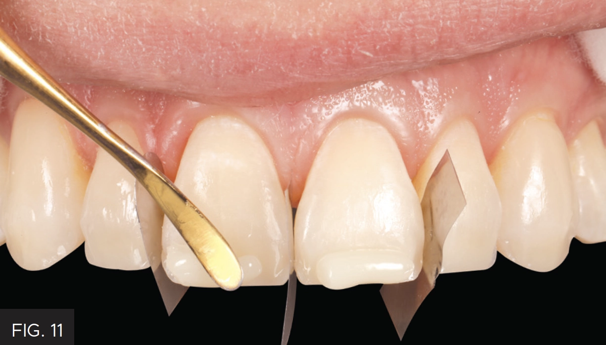 The application of this A2D composite layer is accomplished simultaneously on all prepared teeth to better control thickness and contours. Evanesce ENI is now placed to the full facial contour with a slight excess left for finishing. (FIG 11)