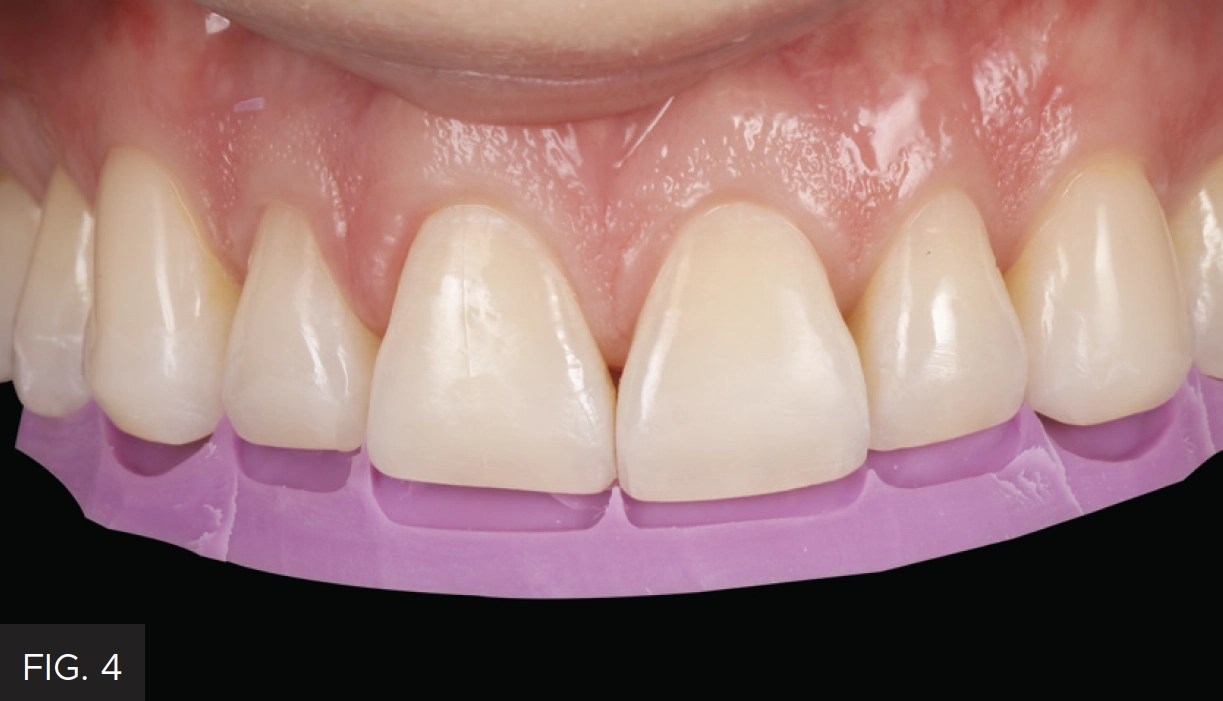 The unbonded composite mock-up was easily removed from the teeth as the lingual matrix was tried in for fit and accuracy. (FIG 4)
