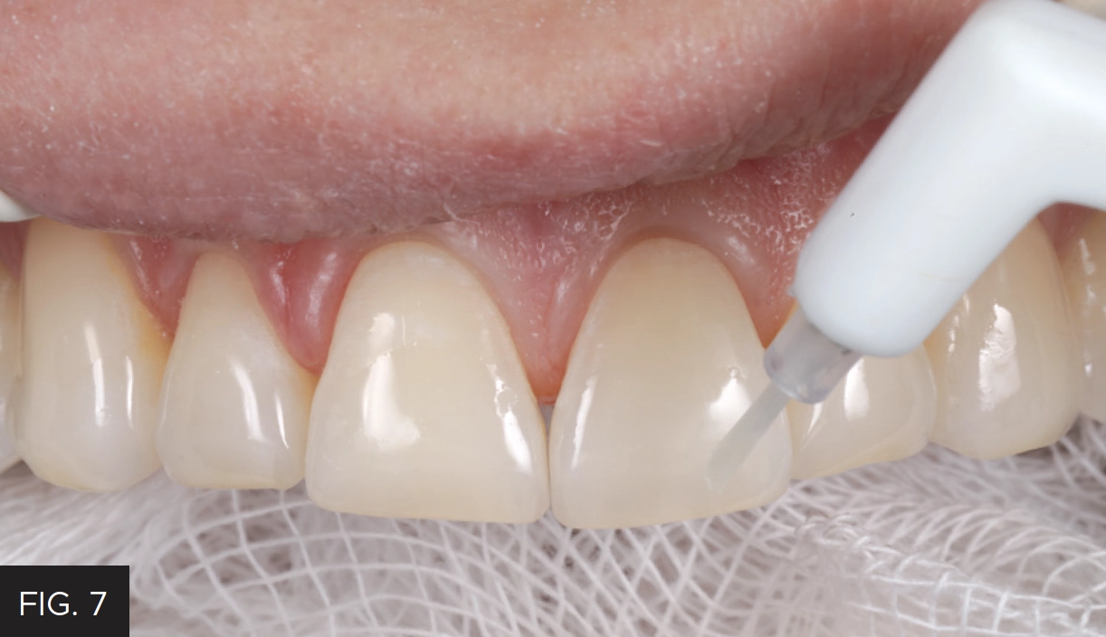 After vigorously rinsing off the acid and controlling the moisture level of the enamel and exposed dentin, Optibond Fl adhesive (Kerr) was applied to the etched surfaces (FIG 7), per the manufacturer’s recommendation, and light-cured.