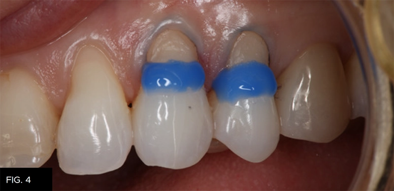 The teeth are anesthetized using buccal infiltration with 4% Septocaine, Epi. 1:100,000. Retraction cord is placed on the facial of each of the teeth to be restored. Ultrapak Cord (Ultradent) #000 is placed using a small non-serrated Slide Packer (Ultradent). Special care must be taken to prevent damage to the periodontium. Using the smallest cord that provides adequate retraction will help prevent damage to the attachment apparatus. (FIG 3)