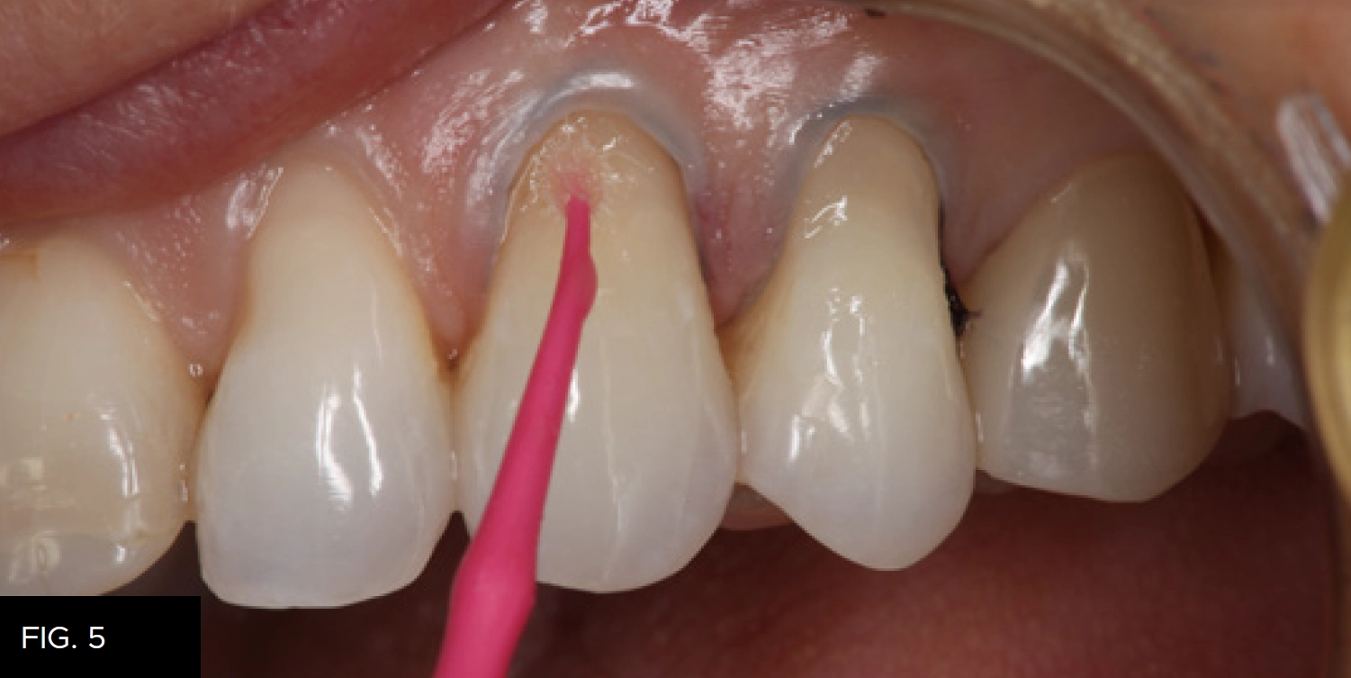 There are three choices for adhesive bonding in the cervical region of a tooth. A total-etch technique, a self-etch technique, or a selective-etch technique. To diminish staining potential and premature marginal breakdown, a selective etch technique is employed.2 This procedure is accomplished using Ultra-Etch, Peak SE and Peak Universal Bond (Ultradent). (FIG 4 and 5) Alternatively, a total-etch adhesive such as MPa Max (Clinician’s Choice) can we used. When total-etch adhesives are used, it is recommended to also use a glutaraldehyde-based desensitizer such as G5 (Clinician’s Choice).