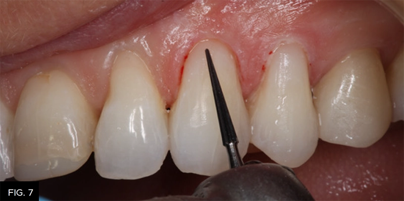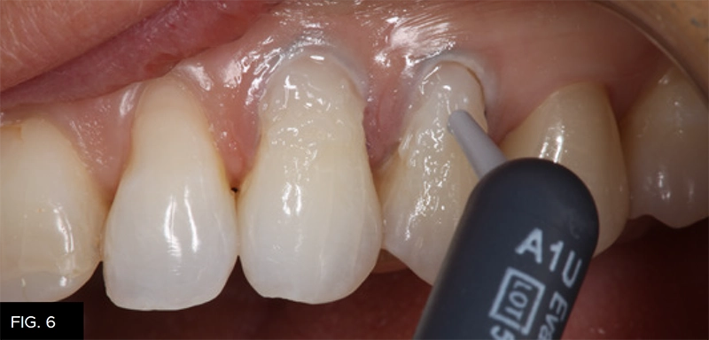 To make cervical restorations disappear seamlessly, the proper opacity of restorative material must be selected. In this case A1U Evanesce Flow (Clinician’s Choice) is used. This material possesses ideal thixotropic handling characteristics for easy placement and has an 85% opacity. Evanesce Flow has excellent optical properties resulting in an ideal blend with natural tooth structure. It is advised that the material be placed on the tooth and cured prior to beginning the procedure to ensure ideal color and opacity. The depth of the lesion should determine how many layers are required. In this clinical situation two layers are placed. (FIG 6)