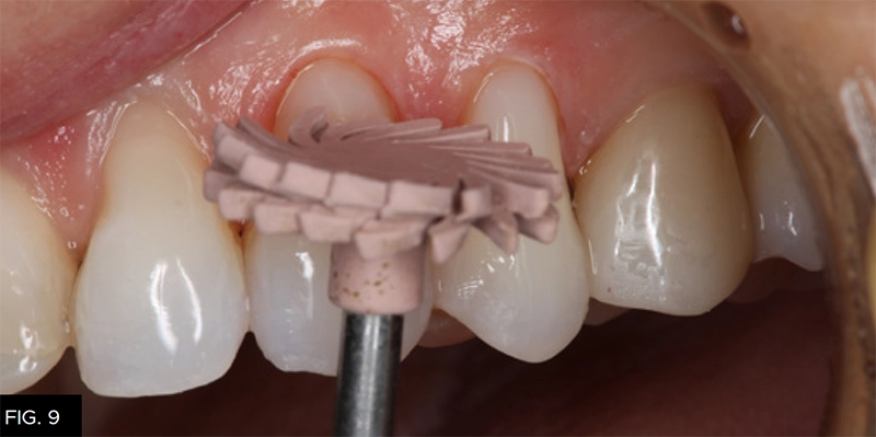To establish initial contour of the restoration a 12-fluted carbide finishing bur is employed. Care must be taken to maintain the height of contour in the cervical third of the tooth. This is accomplished with proper bur angulation. To do this, begin by refining the cervical third of the tooth first. The bur should only be cutting about 2mm from the tip. Once you have cleared the cervical area, the bur is flatted along the middle third of the tooth. Once the contouring is completed, the restoration is polished using A.S.A.P. All Surface Access Polishers, a two step polishing system from Clinician’s Choice. The design of these diamond-impregnated polishers very quickly establishes a high luster without damage to the established contours of the restoration. (FIG 7, 8 and 9)