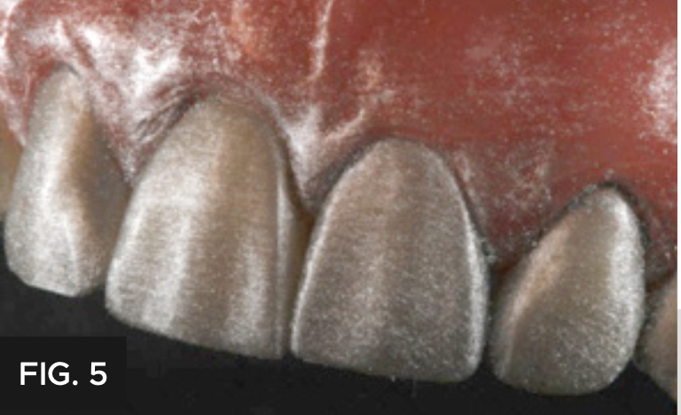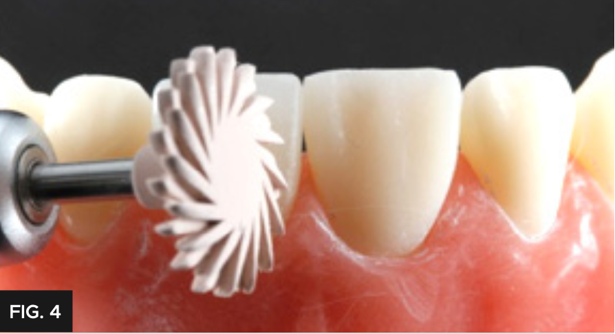 A series of 90 micron aluminum oxide diamond impregnated set of rubber points and cups (ContoursTM Coarse Anatomy Trimmers from Clinician’s Choice® or Astropol® from Ivoclar Vivadent) with water can be used to smooth out any surface irregularities and/or scratches left by the fine diamond flame shape bur to create a subtle, naturally flowing appearance of the secondary anatomy. (FIG. 3)