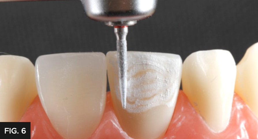Tertiary anatomy generally presents in the form of perikymata or surface stippling that may or may not be present depending on the genetic variation of the patient or the age of the tooth. These characteristics are erased by the friction of mastication forces over time. Perikymata can be very simply placed by running a fine diamond bur at stall-out speed with an air turbine, or using an electric handpiece such as a Bien-Air EVO system at a very low RPM, in a mesiodistal direction on the facial surface. (FIG. 6)