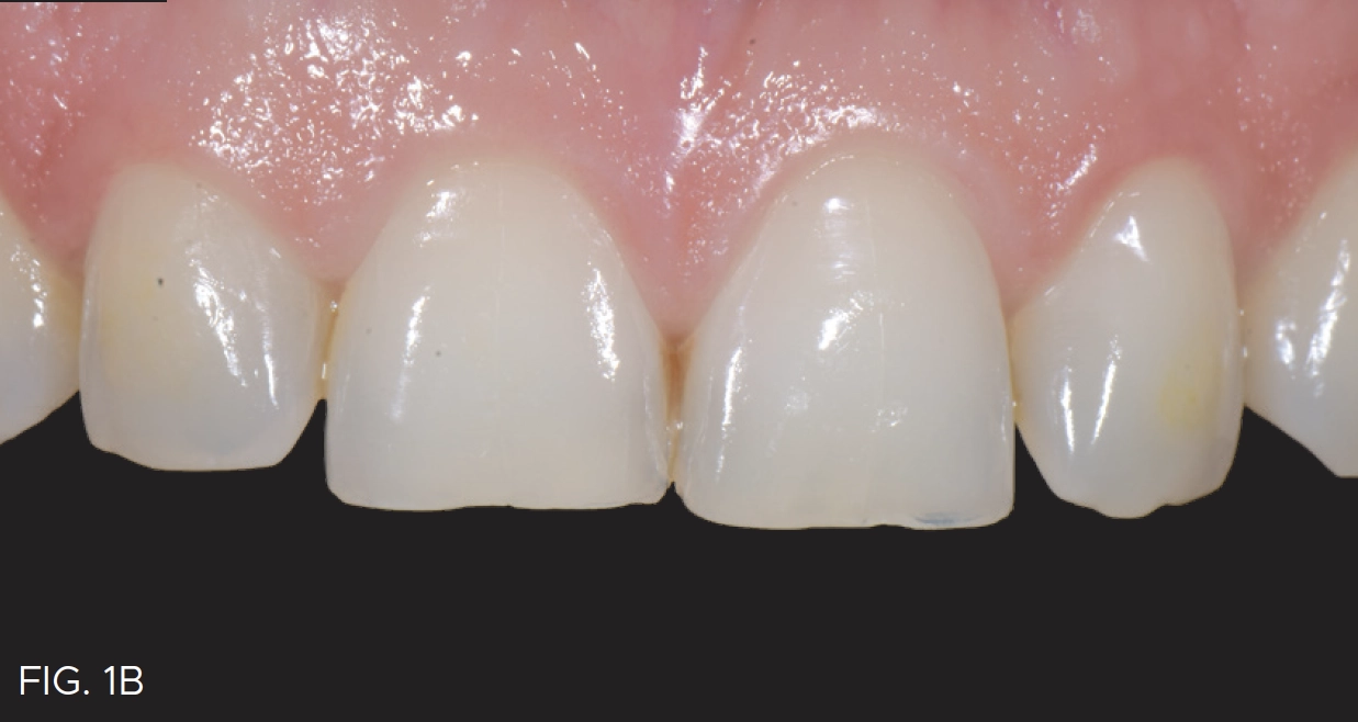 The patient’s desire was to have her smile improved by having her teeth longer and look more natural, and in fact presented with maxillary anterior wear (FIG 1A, 1B). Her teeth were scanned, and models were fabricated and mounted. This revealed the moderate wear of the maxillary anterior teeth as well as a constricted bite.