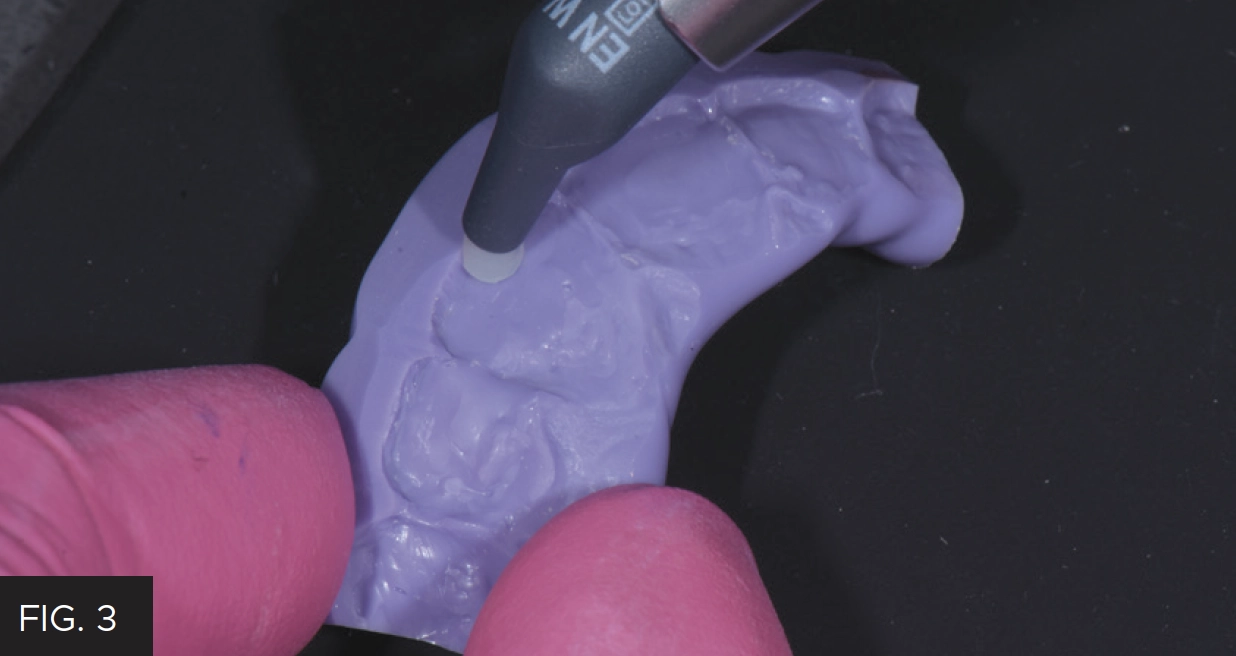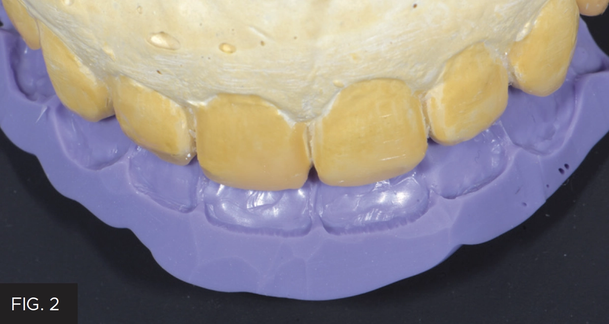An in-office wax-up was prepared on the mounted models to establish ideal incisal length and thickness as well as lingual and facio-incisal contours. A lingual matrix was fabricated using Template Ultra Quick Matrix Material (Clinician’s Choice) on a model of the wax-up in order to accurately transfer this information to the final restorations. (FIG 2)